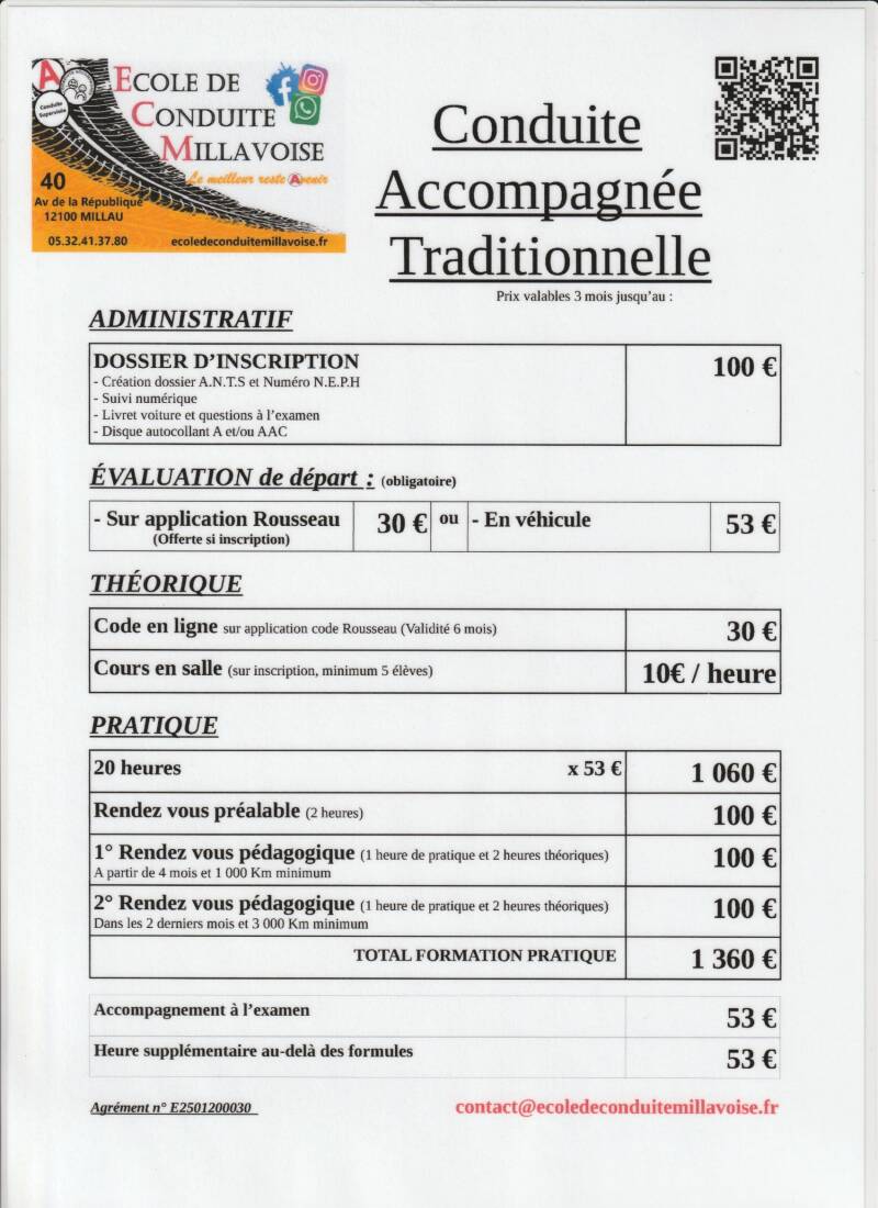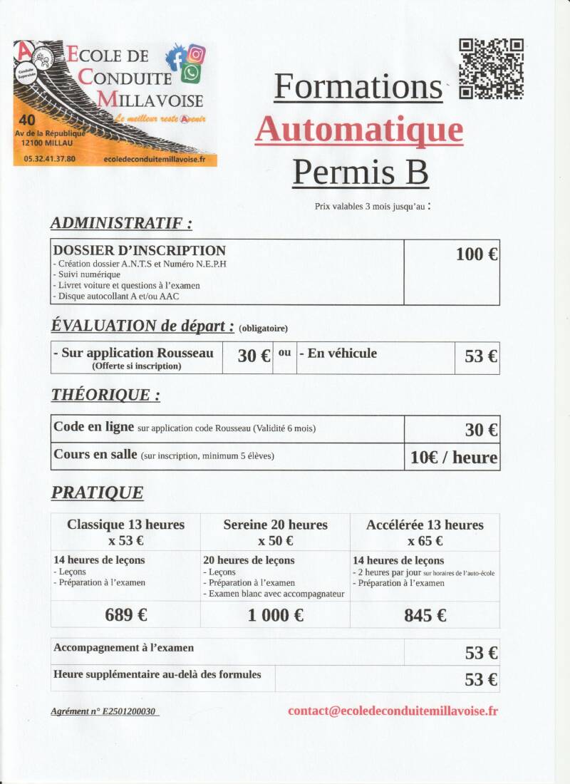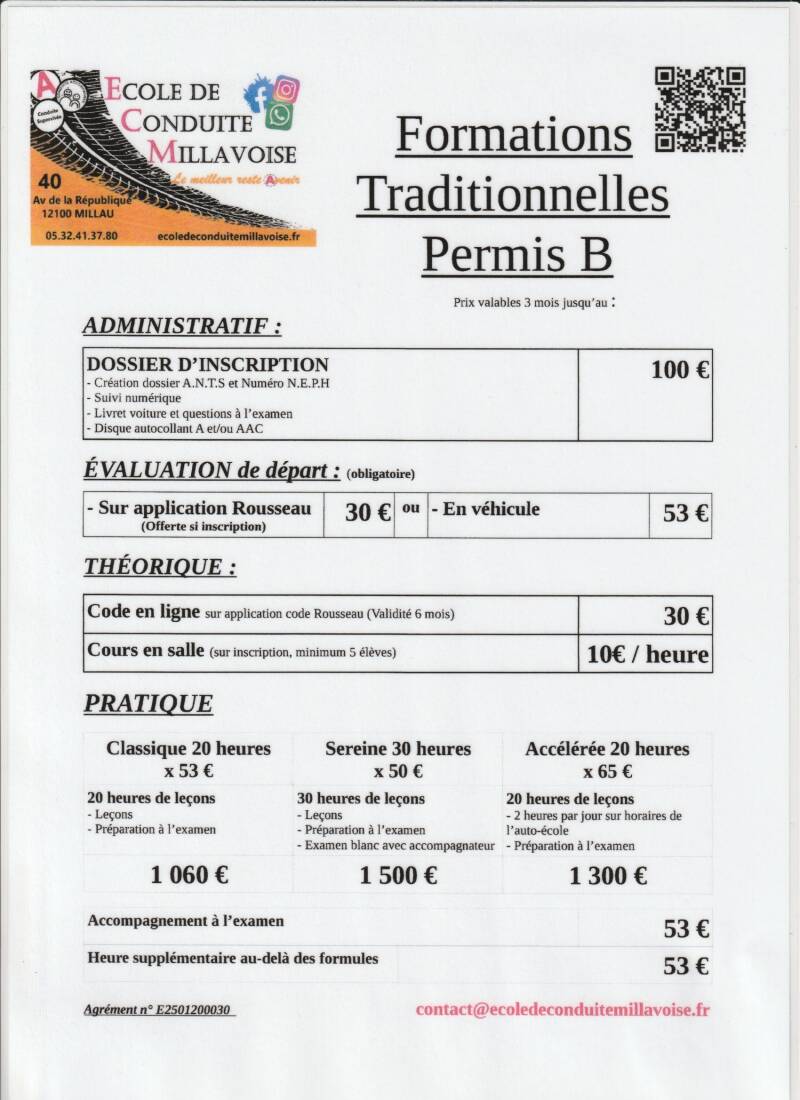Voici les différents forfaits que nous proposons pour votre formation à la conduite chez Ecole de Conduite Millavoise.